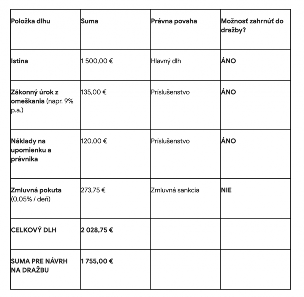 Z príkladu je vidieť, že hoci dlžník reálne dlhuje viac ako 2 000 €, predmetom výkonu záložného práva cez dražbu môže byť len suma 1 755 €. Sumu 273,75 € (zmluvná pokuta) musí správca vymáhať samostatne, napríklad v rámci bežného súdneho konania o zaplatenie sumy, kde už nefiguruje záložné právo ako prednostný titul.